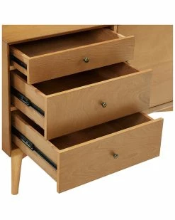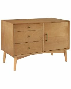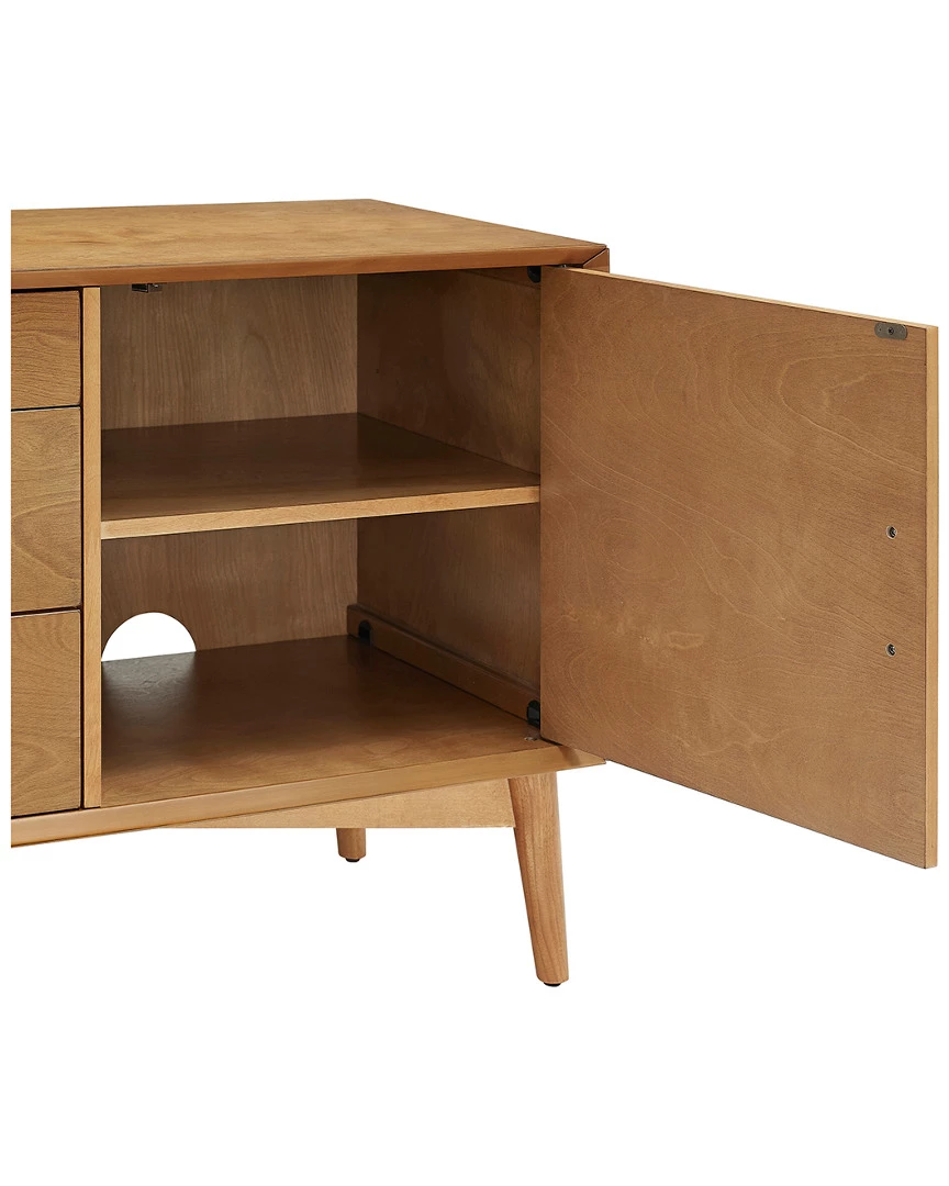 - Design details: Taking cues from mid-century modern design, the Landon Media Center can serve as an innovative media cabinet or a sleek sideboard. Along with the spacious cabinet and adjustable shelves, the three side drawers roll out on full extension glides, giving easy access to every corner. With slender tapered legs and modern lines, the Landon Media Center is perfect for bringing elegant simplicity into any home; Mid-century modern design; Sturdy hardwood construction; Acorn finish; One large cabinet with adjustable shelves; Three large storage drawers; Full extension glides; Ideal for use as a sideboard or media cabinet; Perforated holes in back for cord management; Genuine metal hardware