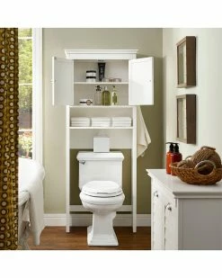 - When it comes to storage, no space in the home creates as much challenge as the bathroom. Designed specifically to fit in the rarely used space around the toilet tank, the Lydia Space Saver offers a number of clever storage features. Keep toiletries and grooming items out of sight in the large cabinet with an adjustable shelf. Below the cabinet is a spacious open shelf ideal for keeping items like hand towels and washcloths close at hand. Handy utility hooks on each side are perfect for hanging a bath towel or robe. Sitting flush against the wall, the Lydia Space Saver is everything you need for over-the-toilet storage.
