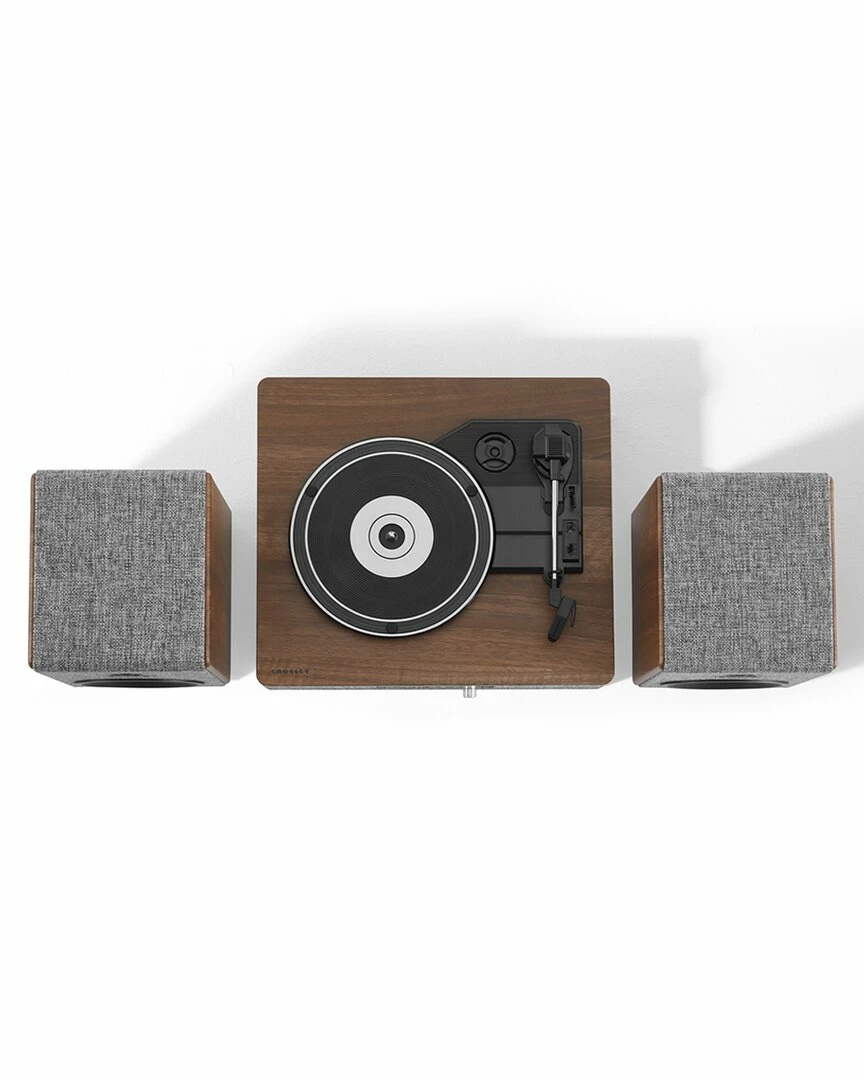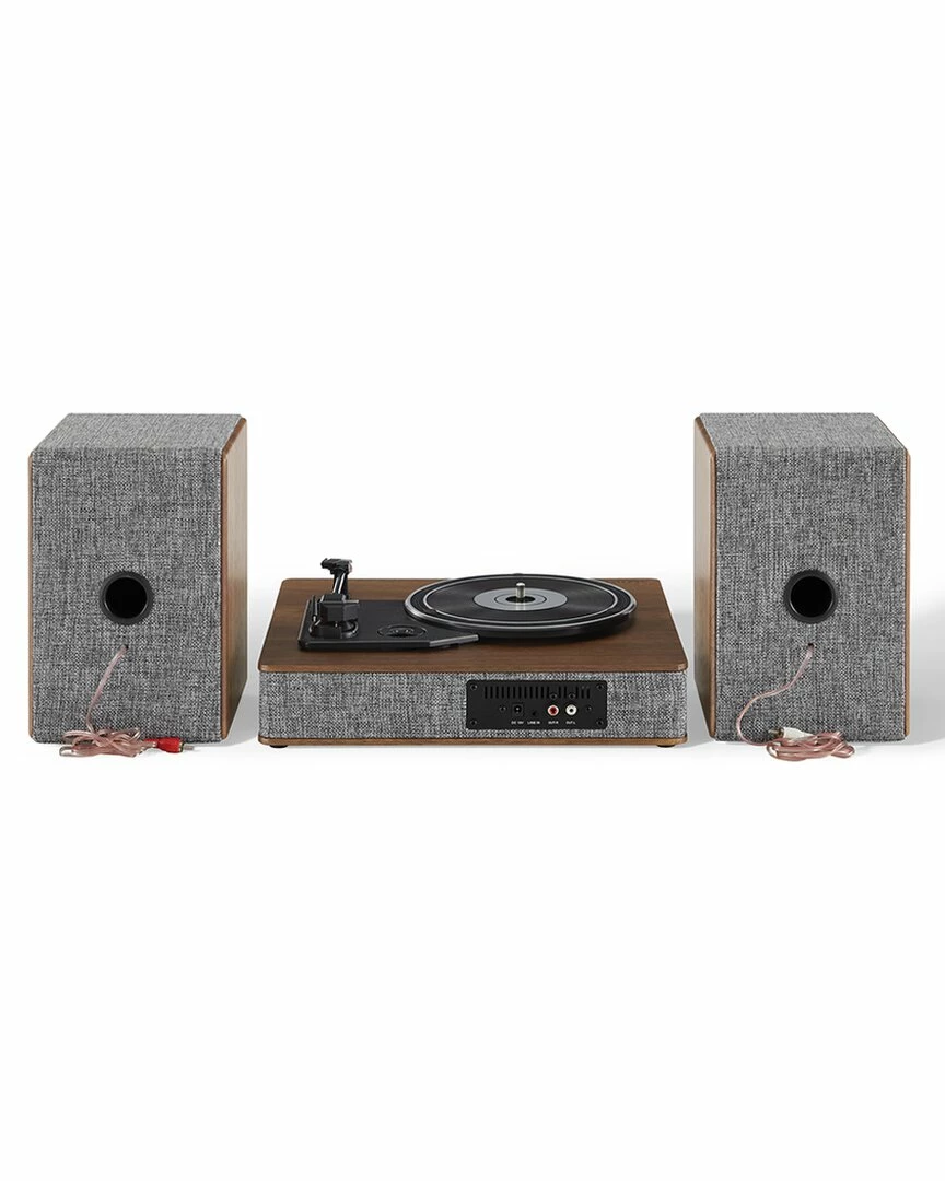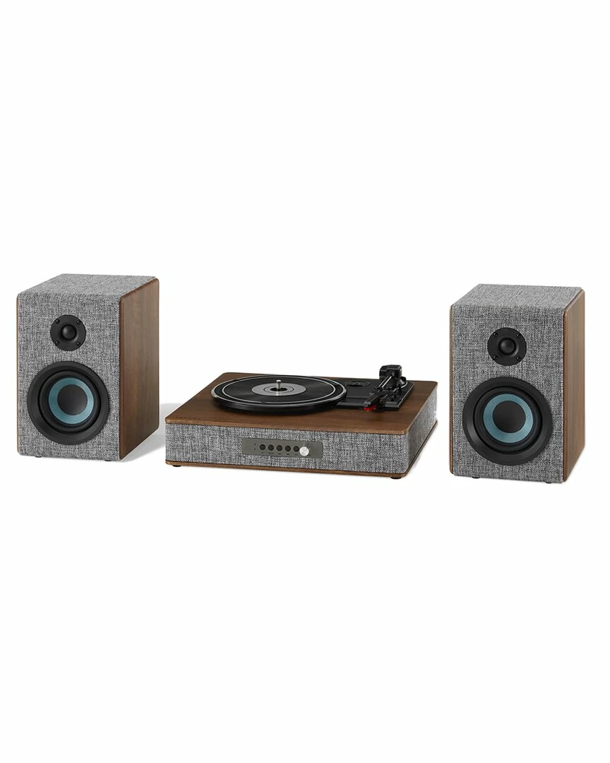 - Design details: they say clothes make the [wo]man, but in this case, they also make the stereo. outfitted in eye-catching heather grey fabric accented with walnut wood and silver accents, the aria shelf system is definitely dressed for success. the aria is more than just a pretty face, though: the three-speed turntable boasts a built-in bluetooth receiver, fm radio, and aux input, and the speakers deliver 2×25 watts of sound. stunning looks and personality to match? were absolutely swiping right on the aria shelf system.