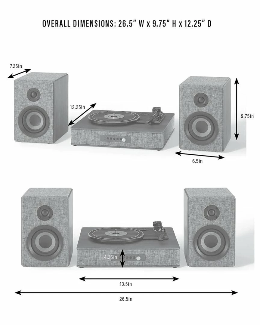 - turntable dimensions: 4.5″h x 13.5″w x 12.25″d