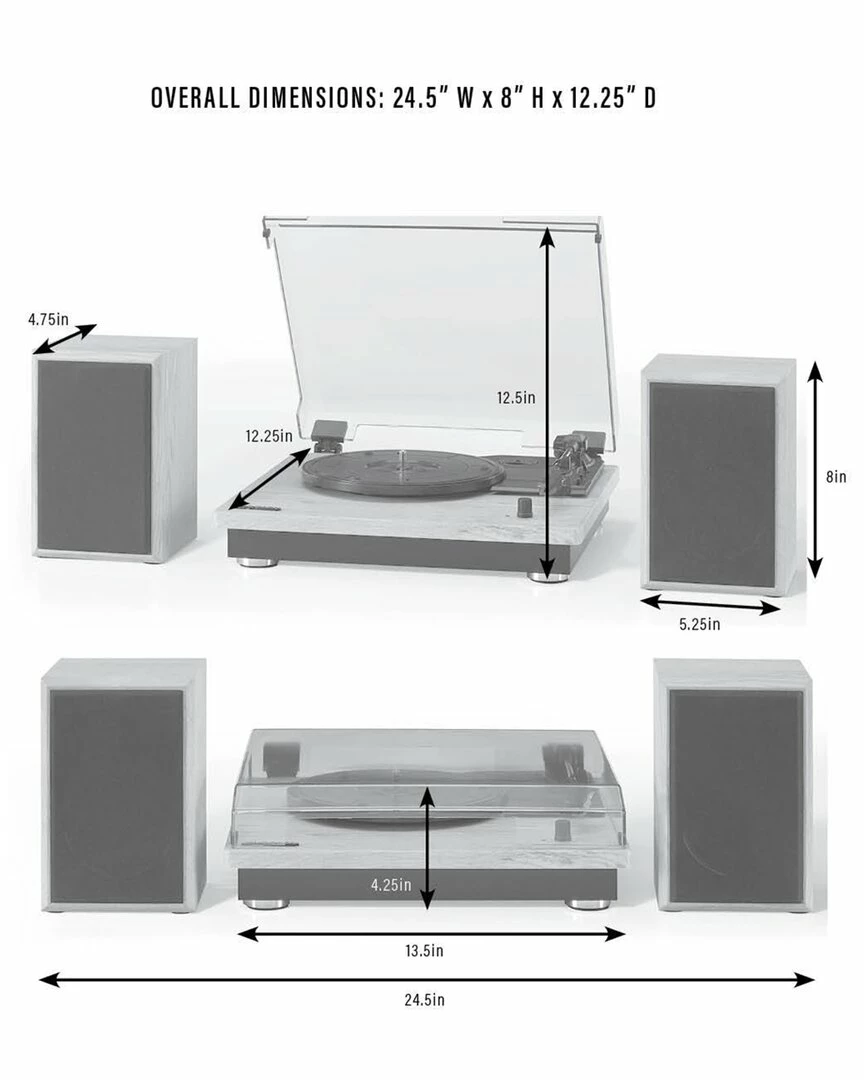 - turntable dimensions: 4.25″h x 13.5″w x 12.25″ d
