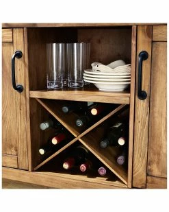 - Design details: Modern simplicity meets rustic charm with the Roots Sideboard. A hand finishing technique provides a unique distressed look to the sideboard while the metal hardware adds an element of industrial chic. With two large drawers, two cabinets, an open shelf and wine storage, this simple design sacrifices no amount of function; Modern, Industrial Farmhouse Design; Natural wood finish; Two large storage drawers; Two Cabinets with adjustable shelving and planked panel doors; Open wine storage for up to 12 bottles; Removable inserts for wine storage ; Industrial metal hardware; Sideboard easily converts to an entertainment console with perforated holes on the back for cord management