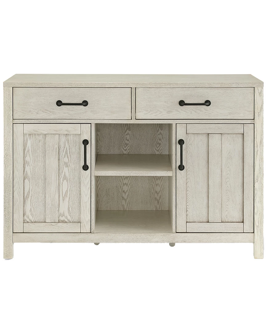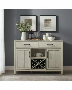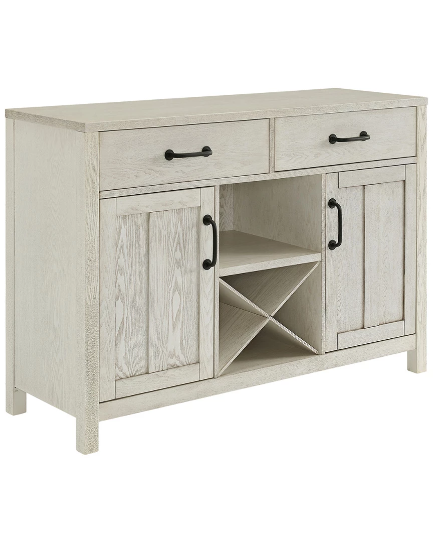 - Design details: Modern simplicity meets rustic charm with the Roots Sideboard. A hand finishing technique provides a unique distressed look to the sideboard while the metal hardware adds an element of industrial chic. With two large drawers, two cabinets, an open shelf and wine storage, this simple design sacrifices no amount of function.