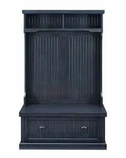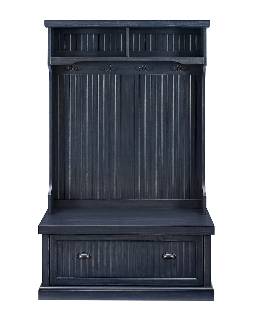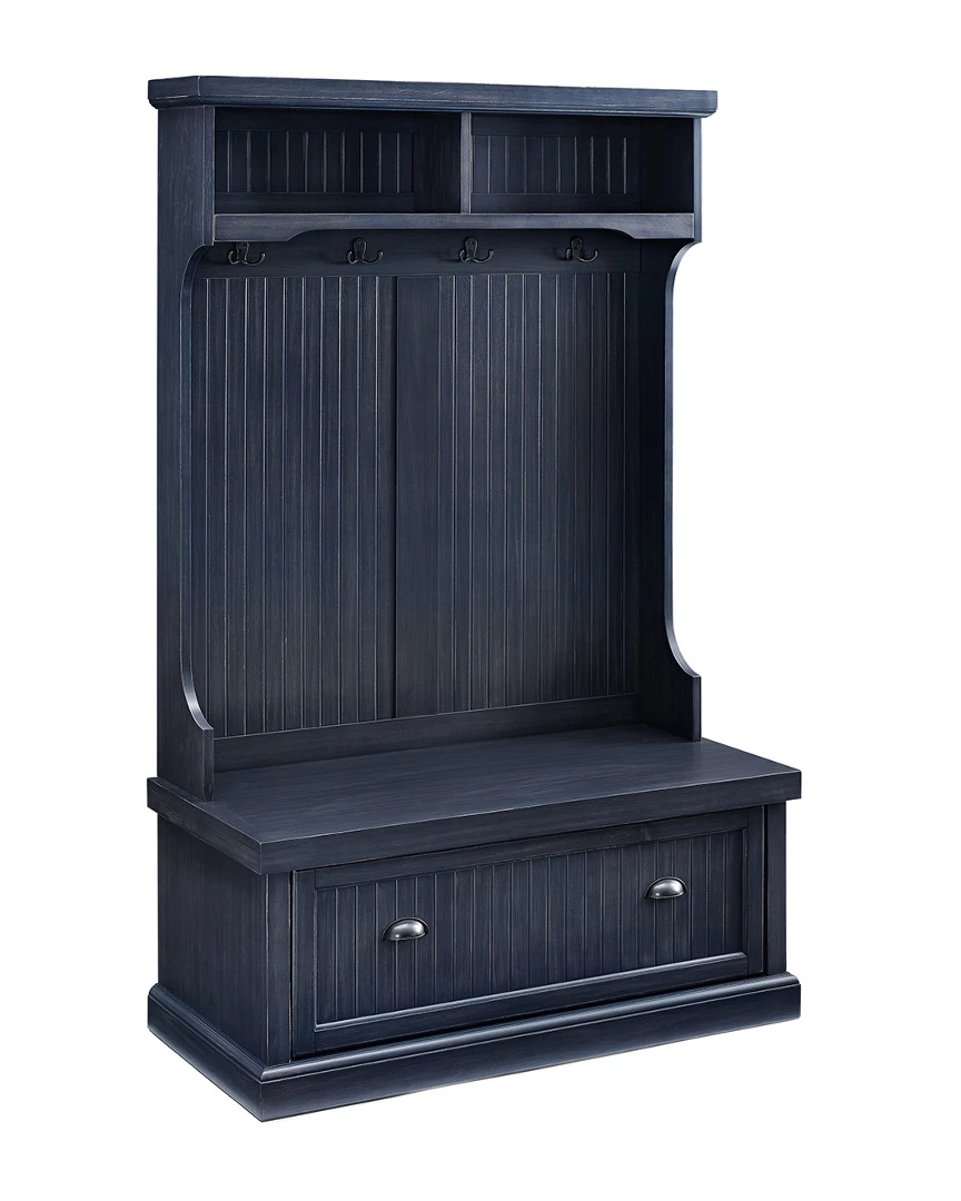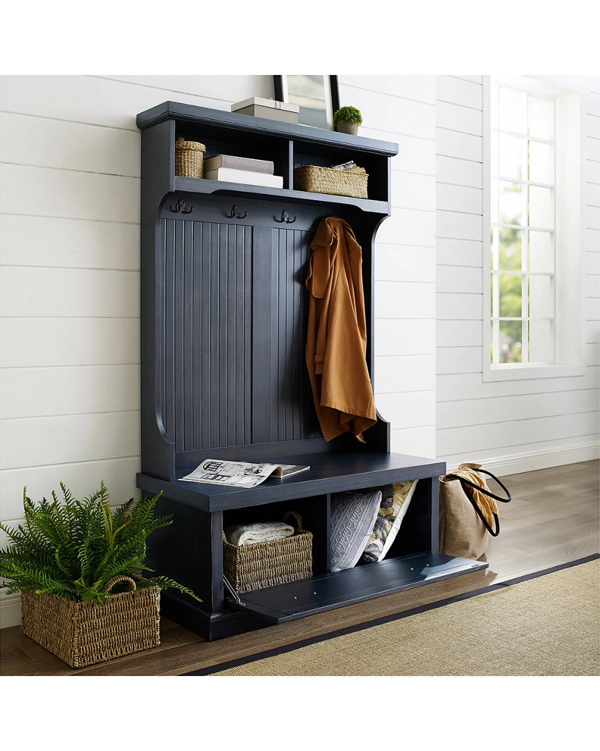 - Design details: Capture the feeling of an effortless beach home with the Seaside Hall Tree from Crosley. Have a seat on the full-sized bench seat, perfect for getting ready for the day. Constructed from solid hardwood and veneers, the weathered surface softens the classical lines and suits any home. Pull the drop-down drawers forward with genuine metal hardware and find two spacious cubbies inside, perfect for storing shoes, scarves, and other clutter best kept out of sight. The tall, slatted back is equipped with hooks for hanging coats out of the way, and two more overhead cubbies offer space for decor or storage; Classic Designs Featuring Beadboard Panels; Constructed of Solid Hardwood & Wood Veneers; Four Double Hooks for Hanging Accessories; Lower Storage Compartment; Two Upper Storage Cabinets; Genuine Metal Hardware; Light Assembly Required