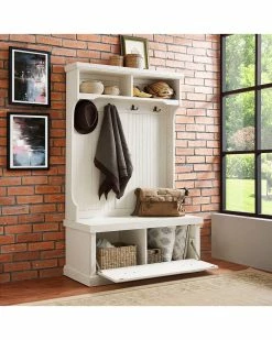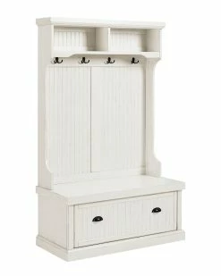 - Design details: Capture the feeling of an effortless beach home with the Seaside Hall Tree from Crosley. Have a seat on the full-sized bench seat, perfect for getting ready for the day. Constructed from solid hardwood and veneers, the weathered surface softens the classical lines and suits any home. Pull the drop-down drawers forward with genuine metal hardware and find two spacious cubbies inside, perfect for storing shoes, scarves, and other clutter best kept out of sight. The tall, slatted back is equipped with hooks for hanging coats out of the way, and two more overhead cubbies offer space for decor or storage; Classic Designs Featuring Beadboard Panels; Constructed of Solid Hardwood & Wood Veneers; Four Double Hooks for Hanging Accessories; Lower Storage Compartment; Two Upper Storage Cabinets; Genuine Metal Hardware; Light Assembly Required