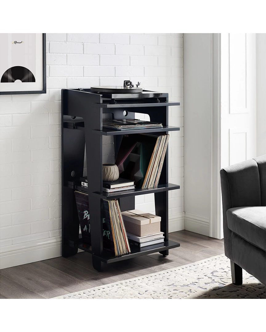 - Design details: The Soho by Crosley is the music lover’s ultimate turntable stand. The top shelf fits most component-style turntables and features two cable management holes to keep your set up tidy. The second shelf is perfect for your accessories: preamp, mini amp, cleaning supplies, etc. and features two more cable management holes. The bottom two shelves can hold up to 100 records each and feature bumpers in the back to ensure that the records sit uniform and are easily accessible. Because details matter, there are three different grooves to display the jacket of the record thats spinning, a headphone hook on the side and space under the bottom shelf to keep your records away from the true enemy: dirt and dust. Were confident that the Soho Turntable Stand is the most thoughtful and affordable solution on the market.