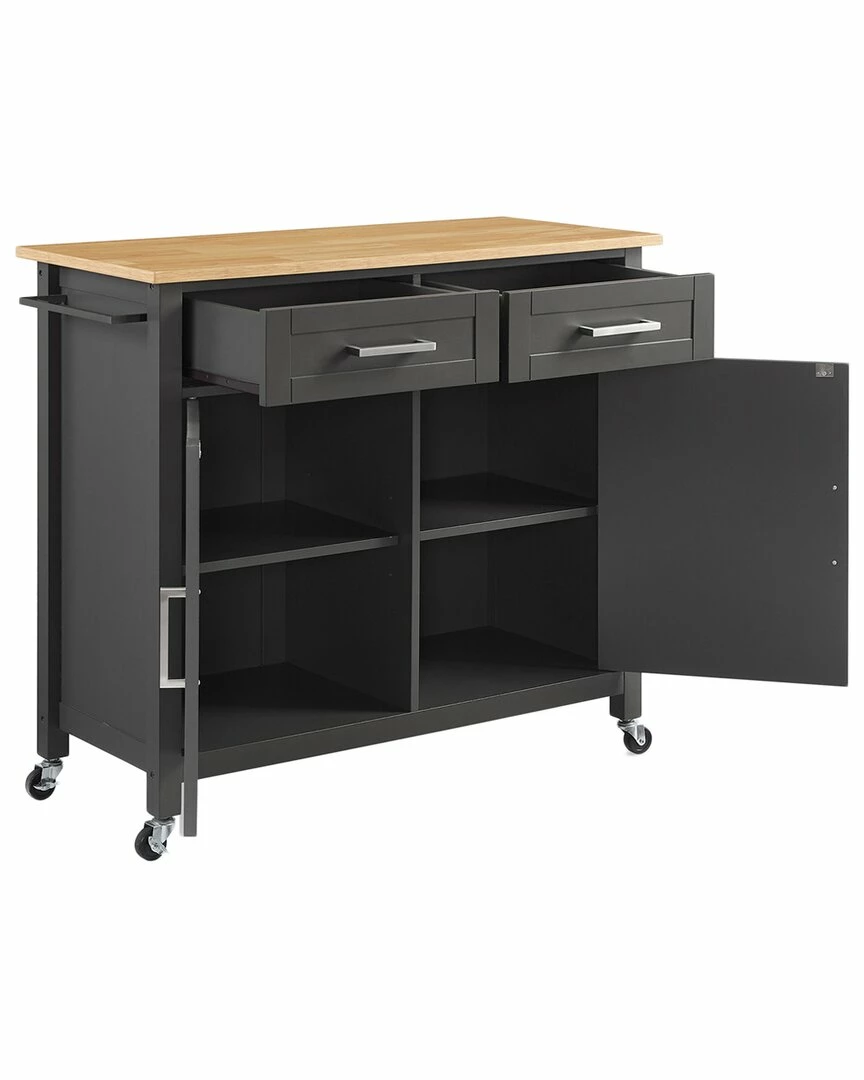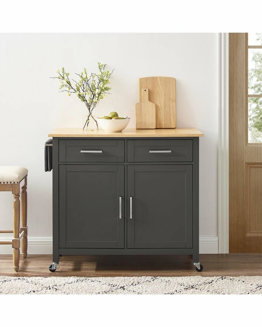 - The Tristan Kitchen Island/Cart offers classic style and ample storage. Two large cabinets with adjustable shelving provide flexibility for storing kitchen essentials like pots and pans, while the storage drawers are ideal for corraling utensils and flatware. A large countertop and towel bar create a convenient workspace. Optional caster wheels allow the Tristan Kitchen Island/Cart to go mobile and adapt to any kitchen space.