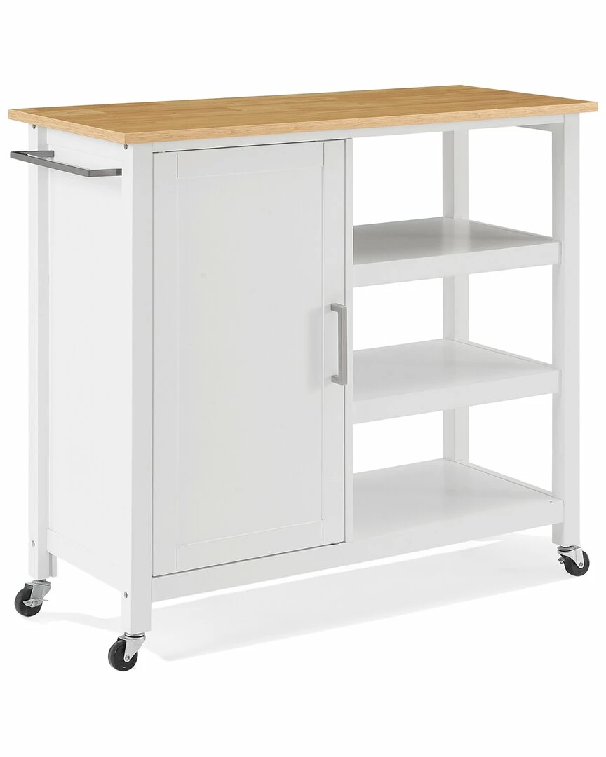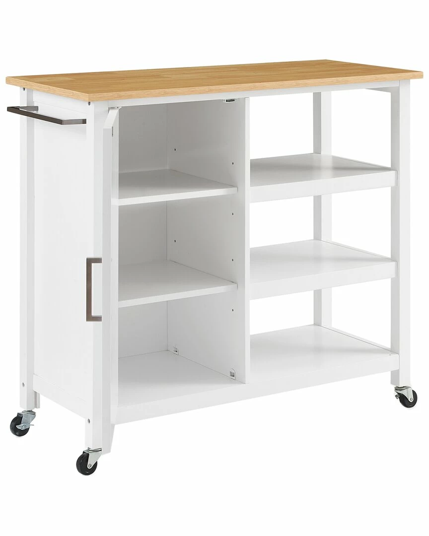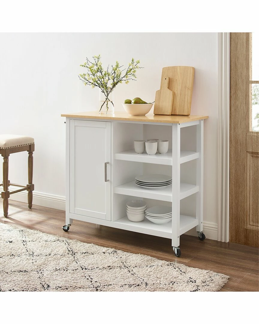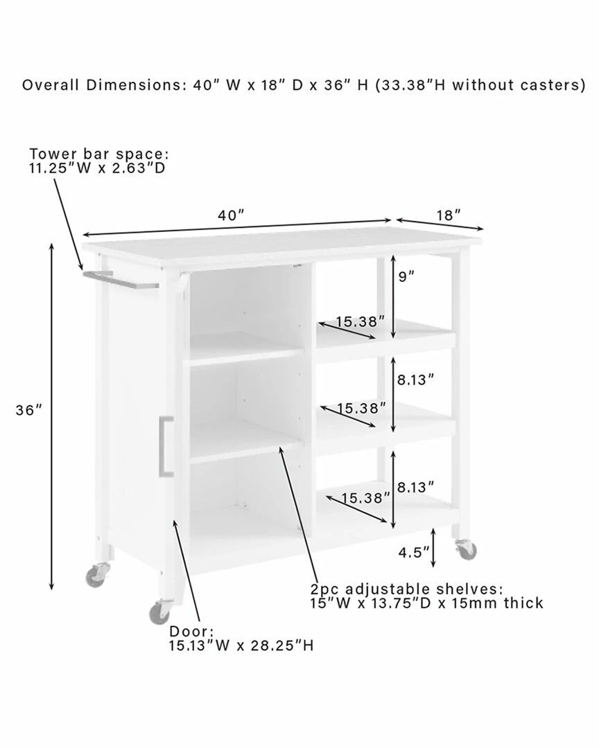 - The Tristan Open Kitchen Island/Cart offers classic style and ample storage. A large cabinet with two adjustable shelves provides flexibility for keeping kitchen essentials out of sight, while three open stationary shelves showcase dishware, cookbooks, and home decor. The large countertop and towel bar create a convenient workspace. Optional caster wheels allow the Tristan Open Kitchen Island/Cart to go mobile and adapt to any kitchen space.