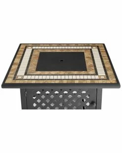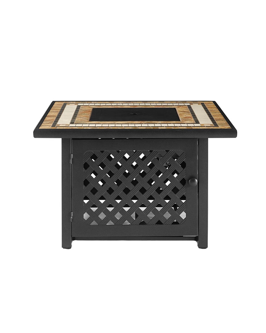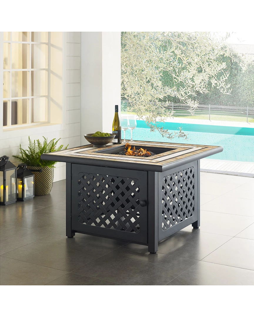 - Gather round the better campfire with the Tucson Outdoor Fire Table from Crosley. Constructed from a sturdy powder-coated steel frame and beautifully tiled stone top, this rugged firepit is ready to become the centerpiece for any outdoor hearth. The simple controls are hidden inside the lattice frame doors, and a sliding base provides easy access to your propane tank. Enjoy 360 degree views of fireside warmth in any season, or safely hide it away with included table and tank covers.